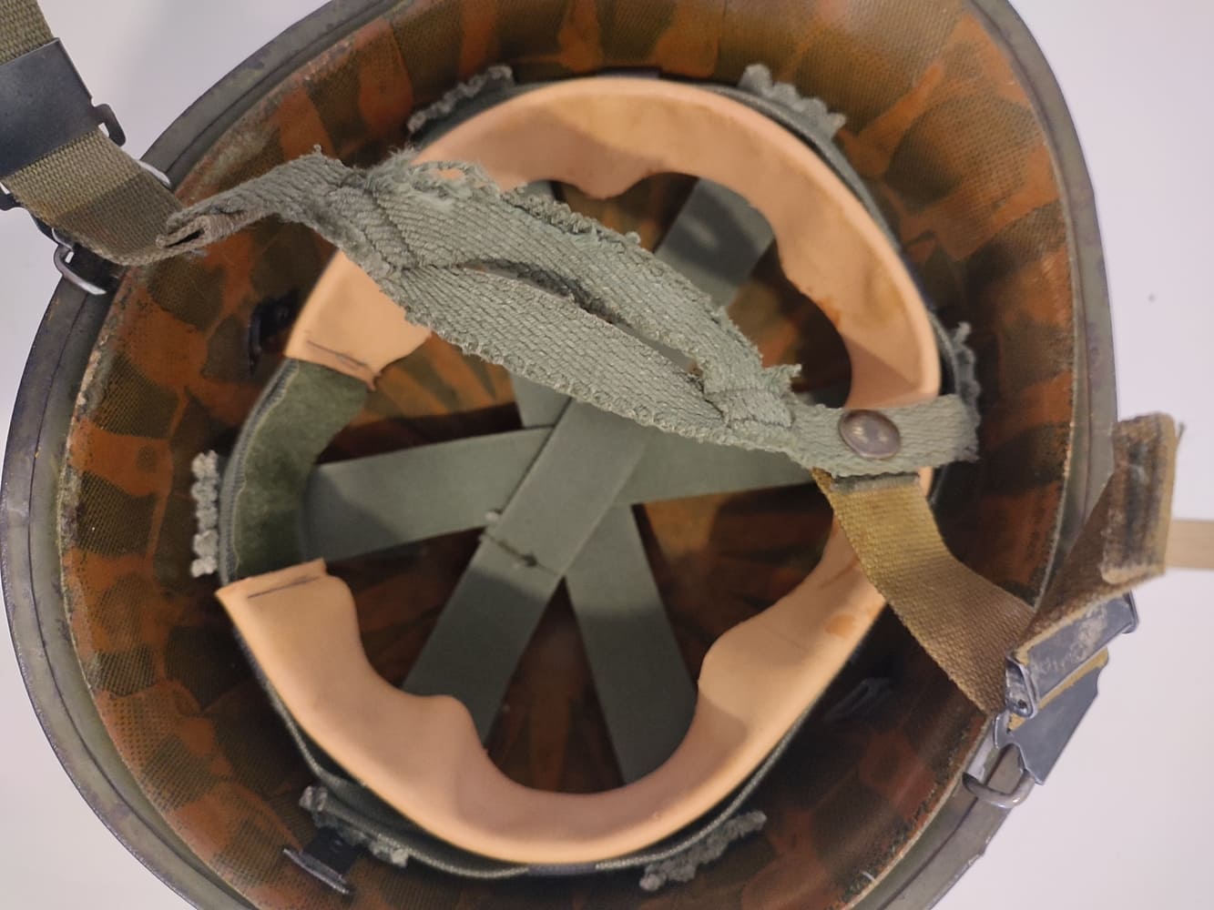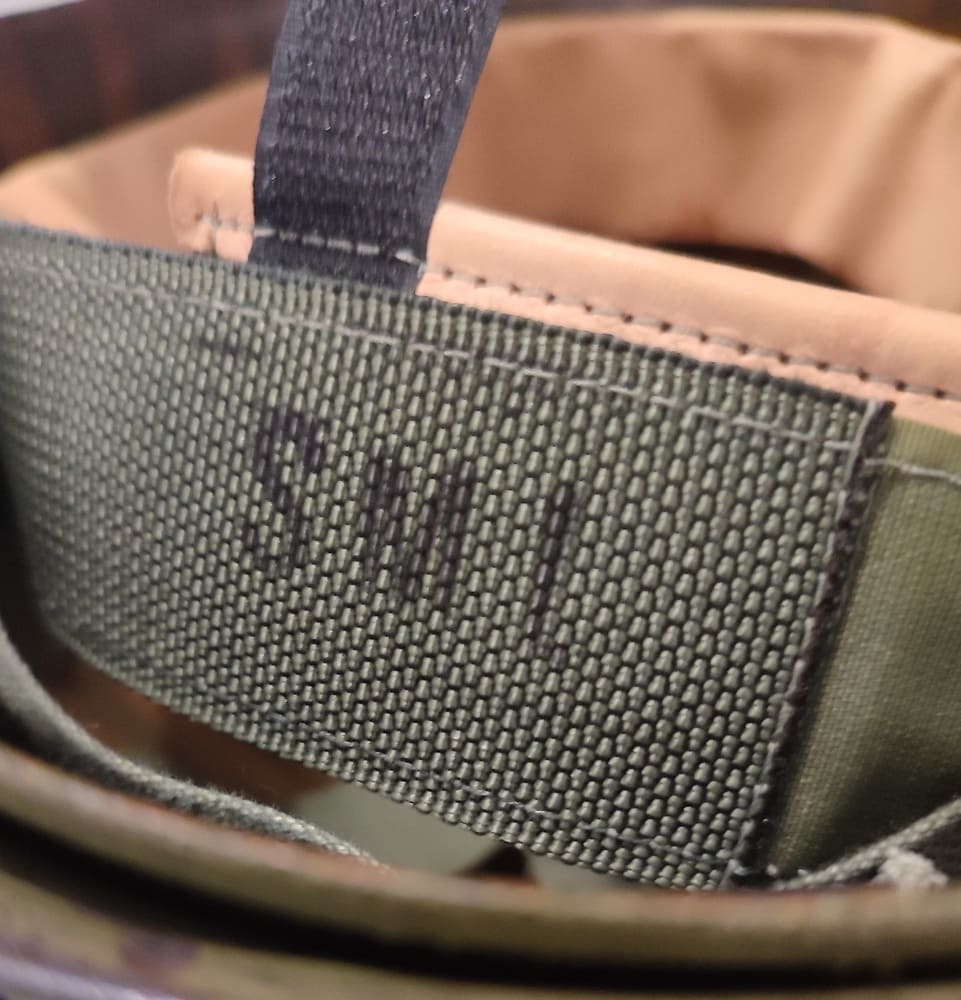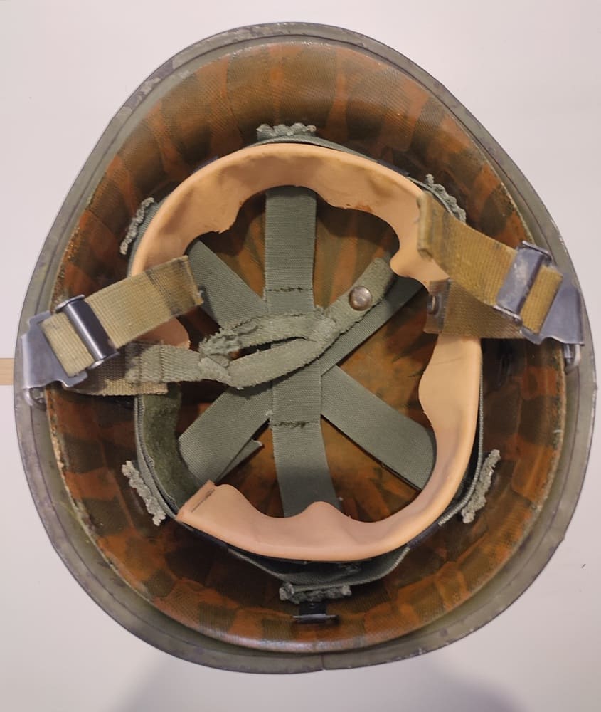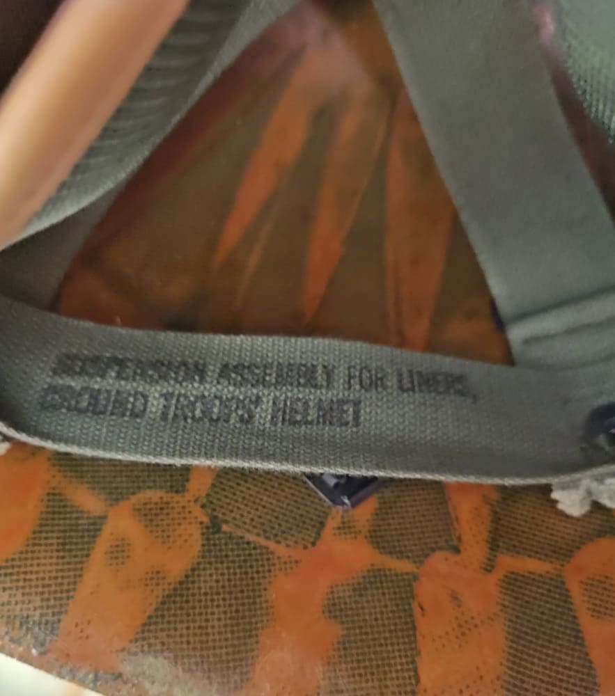 M1972 liner manufactured by Marmac Industries, marked “M22”. Suspension marked: “Suspension Assembly for Liners, Ground Troops Helmet.” The reverse side of the headband is marked “SML”.